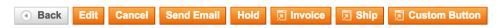 Within the order, invoice and shipment view pages in the admin, the orange buttons located at the top are located within a form container template that is rendered by one of Magento’s default form container blocks.